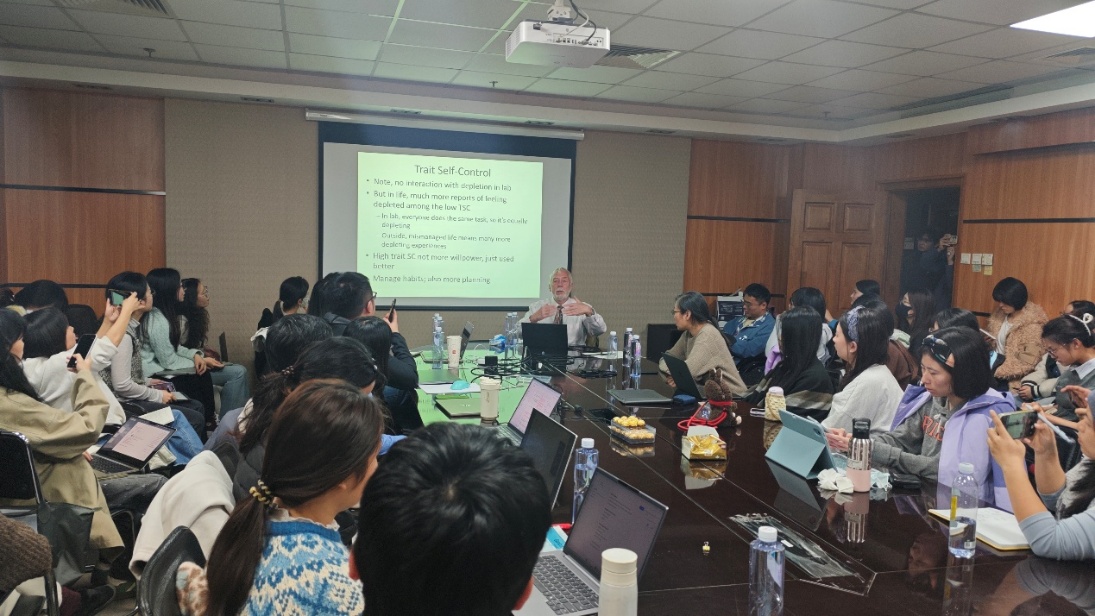 2025年10月22日傍晚18:00 ,面向本科生和研究生的第五场讲座在后主楼2026开展,本次主题为 “意志力、自我损耗与决策”。 Baumeister教授首先指出,良好的自控力与学业成就、维护人际关系、幸福感及健康水平等积极人生成果密切相关。他重点介绍了“自我损耗”理论,即意志力如同肌肉,短期使用后会暂时疲劳,导致自控能力下降。Baumeister教授通过经典的“曲奇与萝卜”实验等研究,揭示了自我损耗对坚持性、注意力、逻辑推理乃至道德判断的负性影响。讲座指出,做决策会消耗同样的心理资源,导致“决策疲劳”,表现为拖延、冲动选择、规避风险和依赖默认选项。因此,建立日常惯例、减少琐碎选择有助于节省意志力。教授强调,意志力虽有限但可通过锻炼增强,并通过培养良好习惯将其自动化,是提升自控力的有效策略。