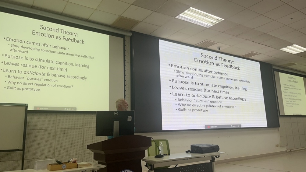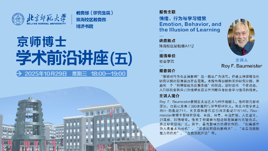 2025年10月29日,美国艺术与科学院院士、国际著名社会心理学家Roy F. Baumeister教授莅临珠海校区励耘楼A112教室,以“情绪、行为与学习错觉”为题为众多学子带来“京师博士生学术前沿讲座”。 本次讲座在 “长江雨课堂”平台同步进行了直播,线上线下共计超过2400人参与。Baumeister教授的分享打破传统认知,为师生带来情绪研究领域的前沿洞见。讲座由海棠书屋 海棠书屋 付媛媛副教授主持。
