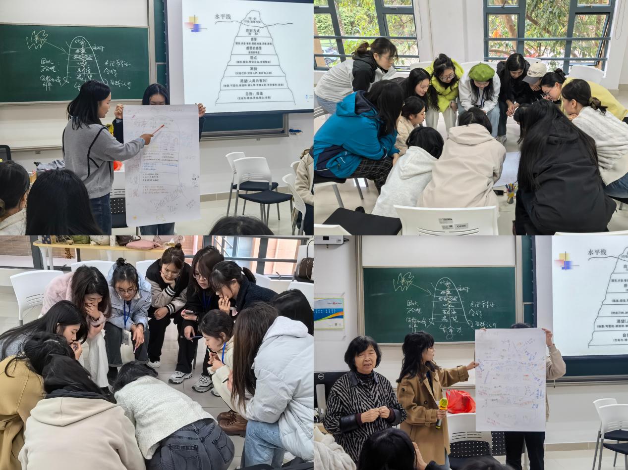 蔺老师在冥想中引导同学们将注意力集中于自身的呼吸和感受,鼓励同学们在交流中加深对彼此作为多元个体的认识,在“把自己比作一种植物描绘生长过程”的冥想绘画中互相聆听对“独特自我”的看法,在人际关系困扰实例中学习冰山理论的分析技巧,在动作演绎中体会不同沟通模式的真实感受,也在小组讨论中挖掘每一种沟通模式背后积极向上的个体生命力。