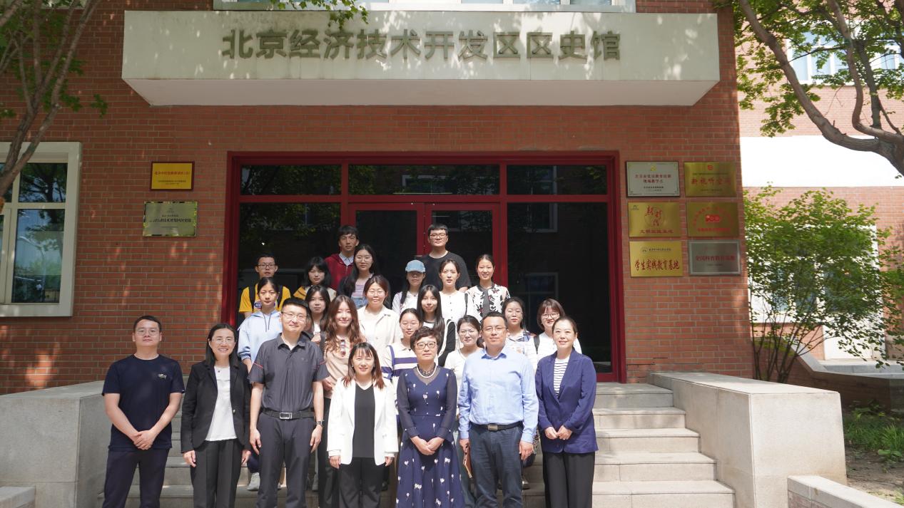 调研第二站是北京经开区区史馆。区史馆所在地即为当年经开区管委会原址。三层红楼建筑记录了经开区从上世纪末的京郊农地逐渐发展为高科技现代化产业园区的辉煌开拓史。从1991年8月决定建设“北京市亦庄工业小区”,历经三十余年的发展,经过数次产业、空间规划调整,经开区从起步区3.83平方公里扩展到现在亦庄新城225平方公里、2023年规模以上工业总产值超5200亿元的国家级经济技术开发区。经开区的发展史是国家经济功能区向产城融合的新城发展缩影。师生们通过文字图片和内容讲解,更深刻、具体体会到了时代的沧桑巨变,以及科技创新对经济和社会发展的重要促进作用。