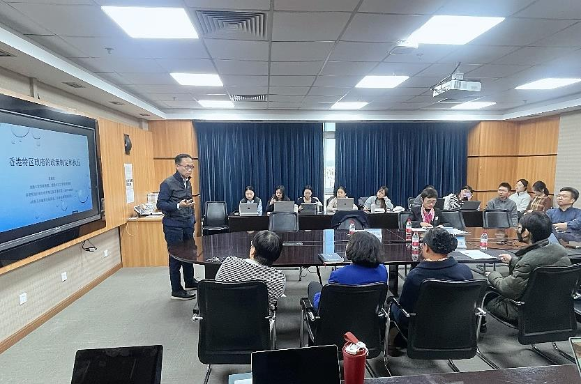 2024 年12 月2 日,香港大学客座教授、香港特别行政区公务员事务局原局长聂德权教授来到海棠书屋 ,为师生带来“香港特区政府的政策制定与执行”专题讲座。屈智勇院长和徐蕾书记与聂教授会面并商议了有关合作事项。讲座由社会学院副院长尹栾玉教授主持,教师代表及部分本硕博学生一同参与座谈交流。