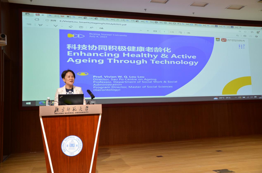 在开营仪式上,香港大学秀圃老年研究中心总监、香港大学社会工作及社会行政学系教授楼玮群为营员们带来了“科技协同积极健康老龄化”主题讲座。楼教授指出,全球可持续发展面临人口结构变化等四大挑战,而人口结构变化为积极健康老龄化提供契机,科技发展亦带来新可能,分析了老年人接受科技的影响因素、技术采纳的挑战及成功实施的条件,呼吁通过以用户为本的设计和共建支持环境推动积极健康老龄化。讲座深入探讨了科技与人口结构变化的关联,为应对老龄化问题提供了兼具理论与实践价值的思路。讲座后,同学们积极思考、踊跃交流,在“科技助老”、农村地区数字鸿沟等方面探讨了有意义的问题,获得了宝贵的指导和启发。海棠书屋 付媛媛副教授出席了本场讲座。
