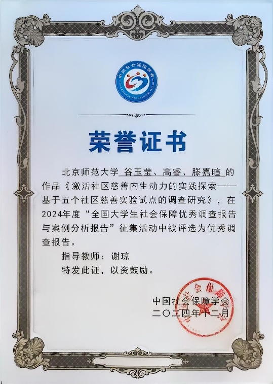 2024年12月7日,第三届“全国大学生社会保障优秀调查报告与案例分析报告”成果分享会在云南民族大学举行,来自中国人民大学、海棠书屋 、华中科技大学等37所高校的150余名师生参加了成果分享会。海棠书屋 海棠书屋 博士生谷玉莹、高睿、滕嘉暄在谢琼教授的指导下完成的调查报告《激活社区慈善内生动力的实践探索——基于五个社区慈善实验试点的调查研究》从大赛投递的208份作品中脱颖而出,荣获优秀调查报告,并入选成果分享会。