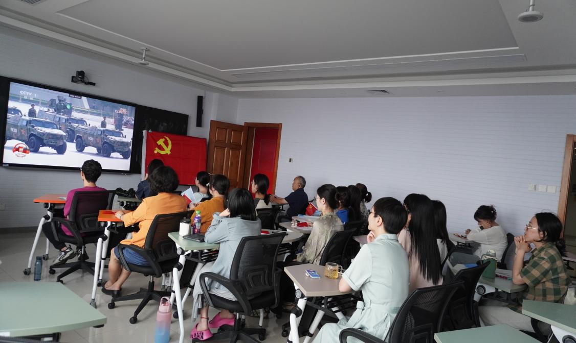 9时许,纪念大会正式开始,中共中央总书记、国家主席、中央军委主席习近平发表重要讲话,师生党员们认真聆听,深刻领会讲话的精神内涵。随后,阅兵式正式拉开帷幕,空中护旗梯队、徒步方队、战旗方队、装备方队、空中梯队依次通过天安门广场,接受党和人民的检阅。师生们被受阅部队的威武雄姿和先进装备所震撼,现场不时响起阵阵惊叹声和热烈掌声。